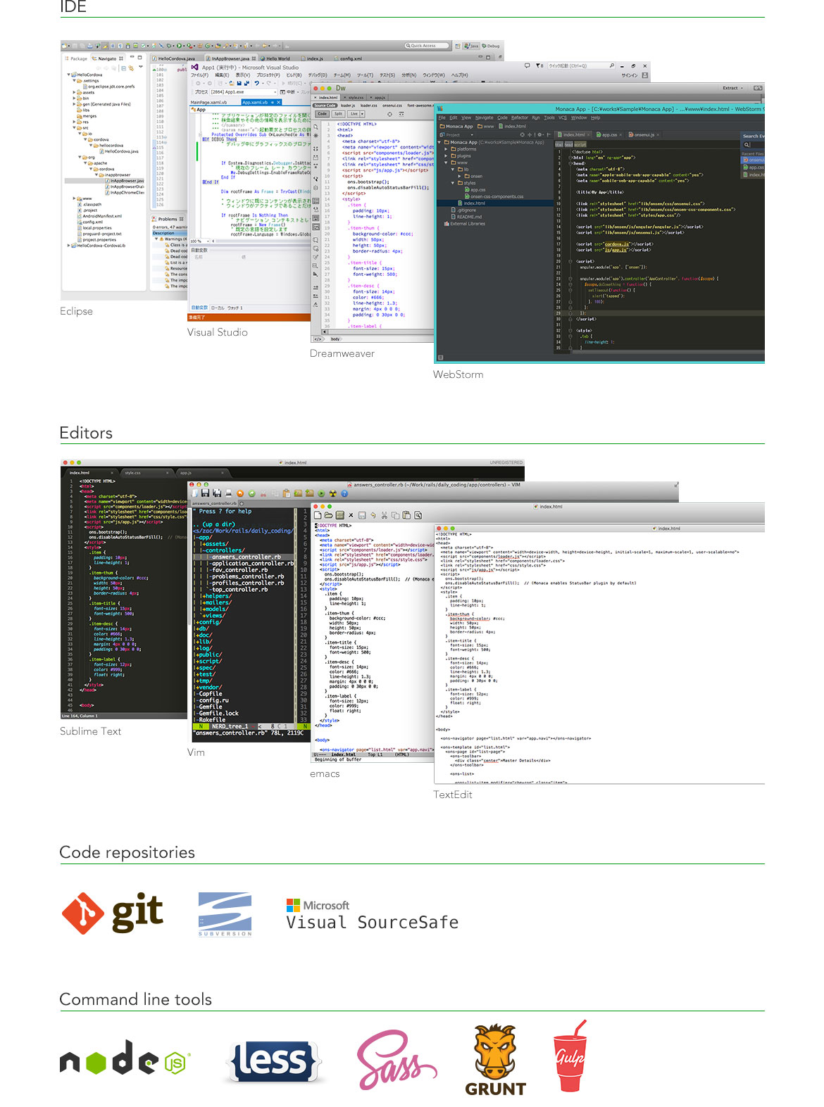 Monaca Localkit enables developers to create apps locally using their favorite development environment including Visual Studio, Eclipse, Dreamweaver, and Sublime Text. You can also use it with version control tools like Git and Subversion. Choose the best environment based on your target user and purpose.